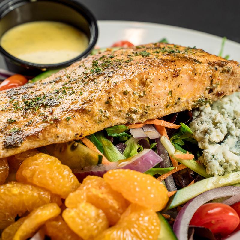 Mixed greens, tomatoes, cucumbers, red onion, mandarin oranges, gorgonzola cheese, topped with grilled salmon and a citrus vinaigrette. GF